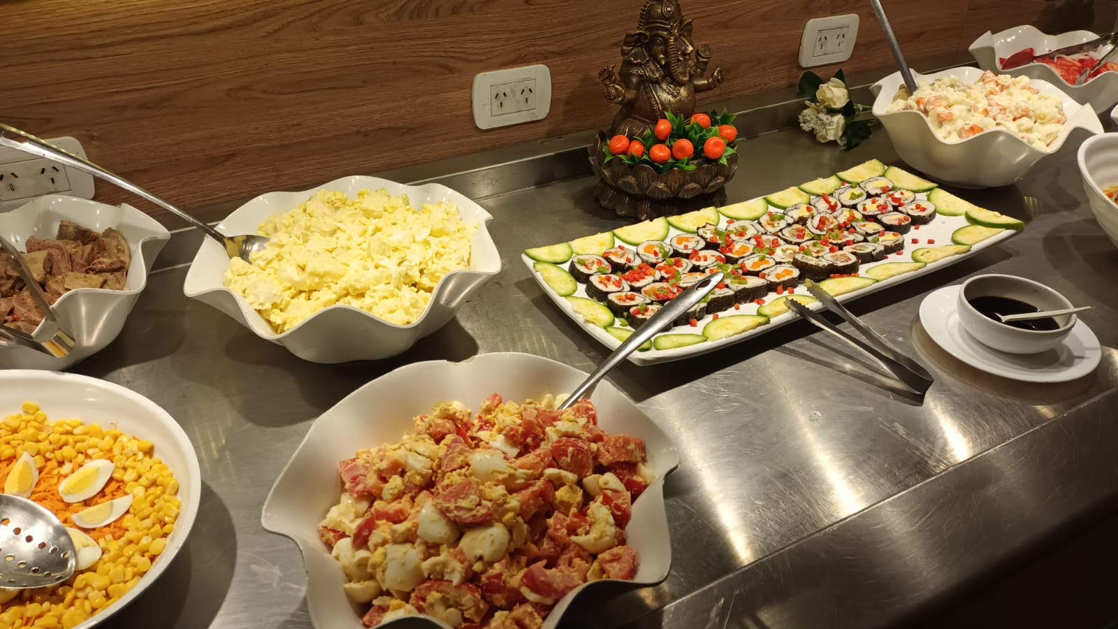 Además, el buffet se completa con propuestas de cocina argentina e inspiración internacional, incluyendo carnes, pollo, pastas caseras, opciones agridulces, guarniciones variadas y una completa mesa fría con ensaladas, sushi y fiambres. A esto se suman estaciones de cocina en vivo con preparaciones al momento, que garantizan frescura y calidad en cada servicio.