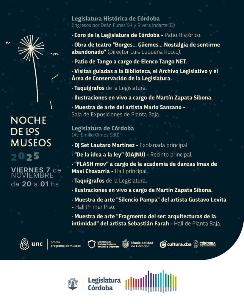 Este viernes 7 de noviembre, entre las 20 y la 1 de la madrugada, la Legislatura de Córdoba volverá a abrir sus puertas para una nueva edición de “La Noche de los Museos”, una de las actividades culturales más esperadas del año. Con entrada libre y gratuita, el público podrá recorrer tanto el nuevo edificio de la Unicameral (avenida Olmos 580) como la Legislatura Histórica (Deán Funes 94), donde se desarrollará una completa agenda artística, patrimonial y participativa.